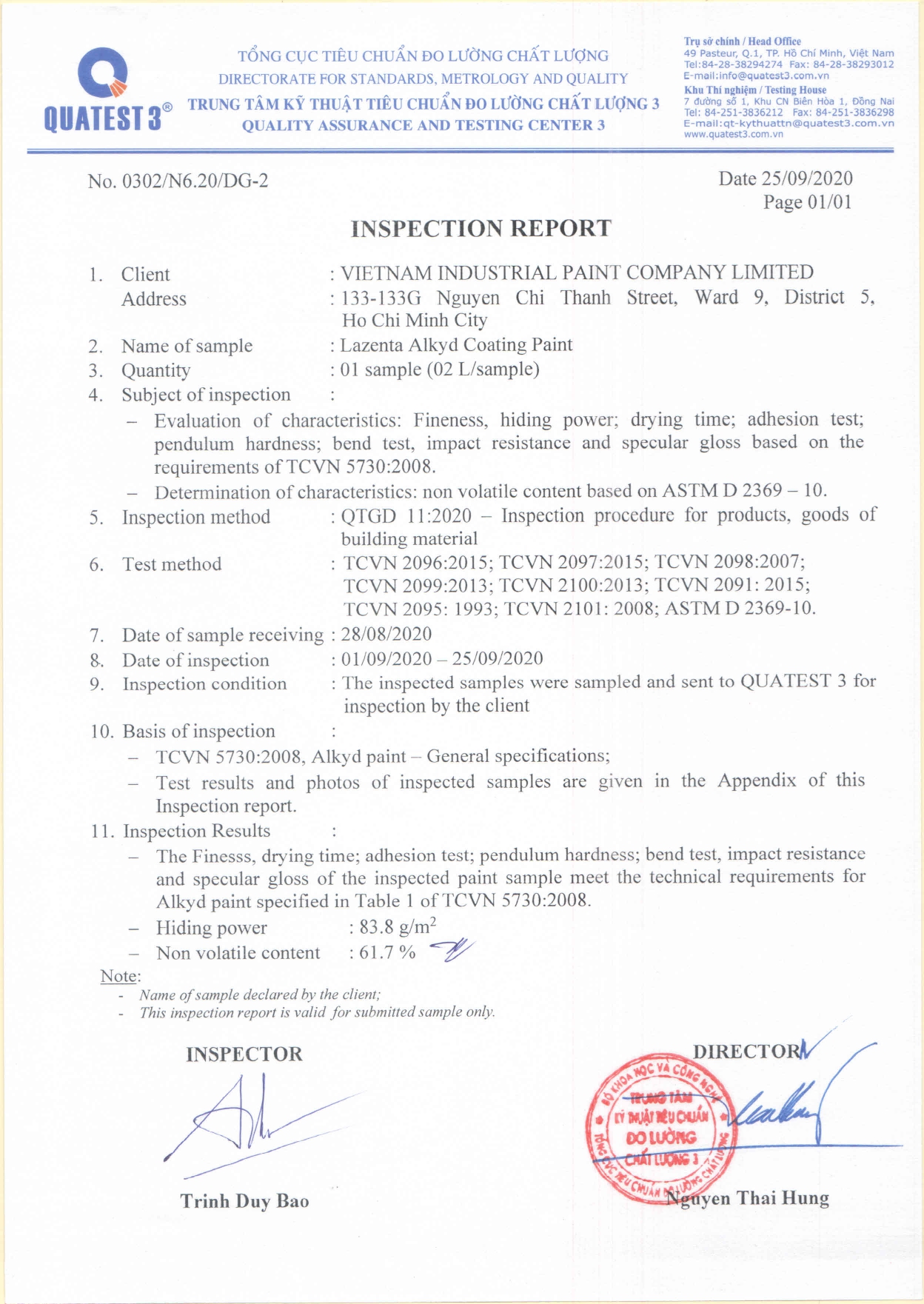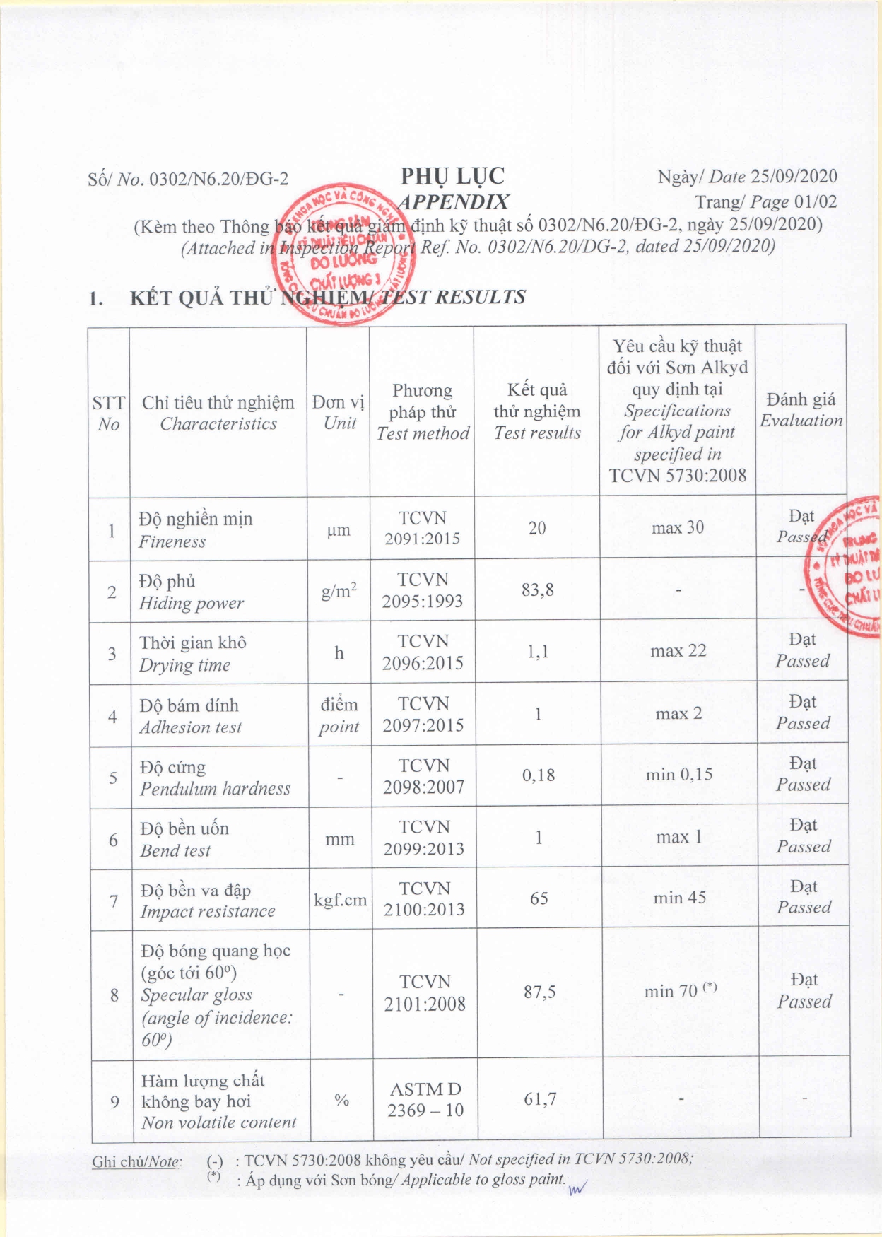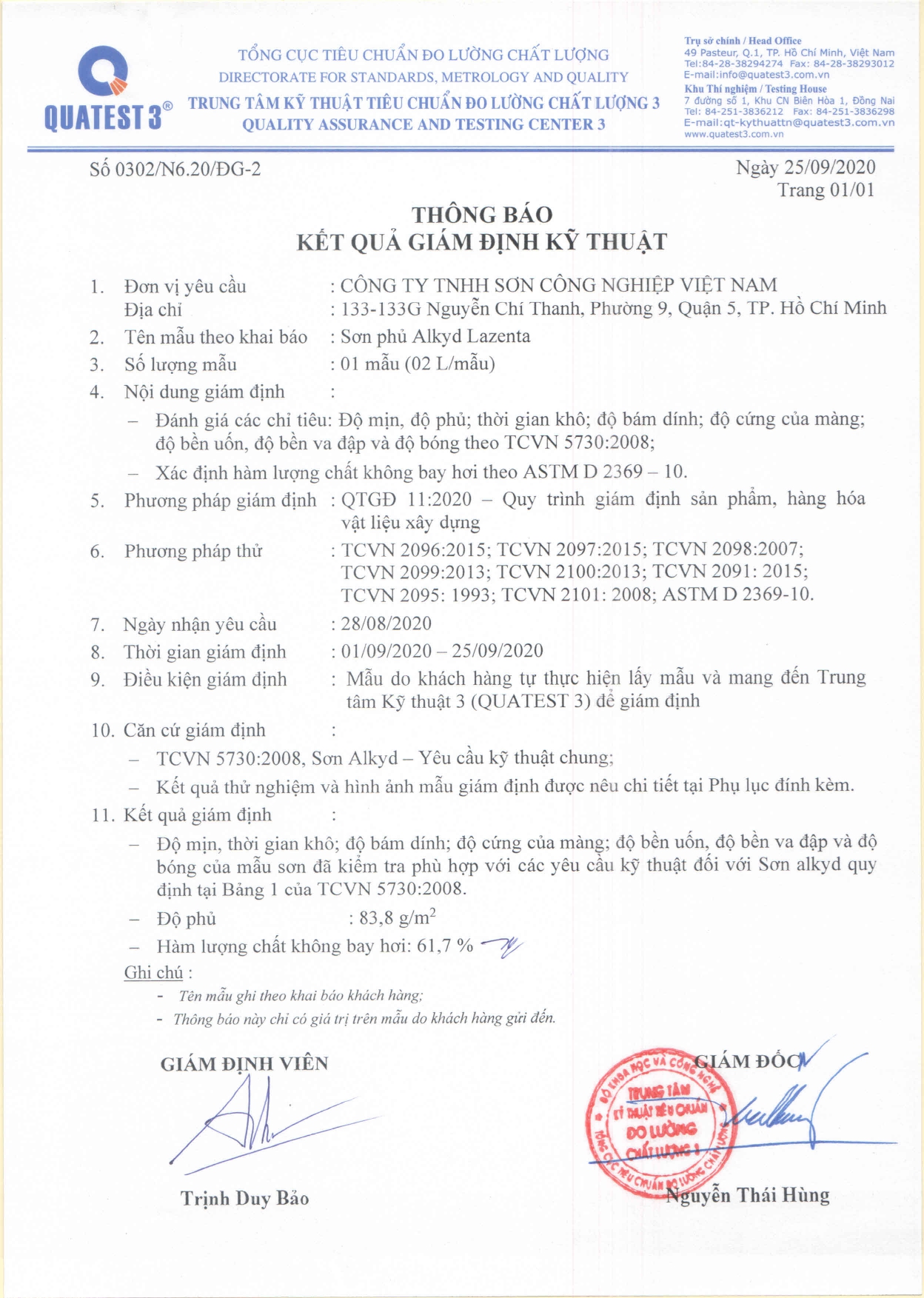 Giấy kiểm định sơn phủ Alkyd lazenta